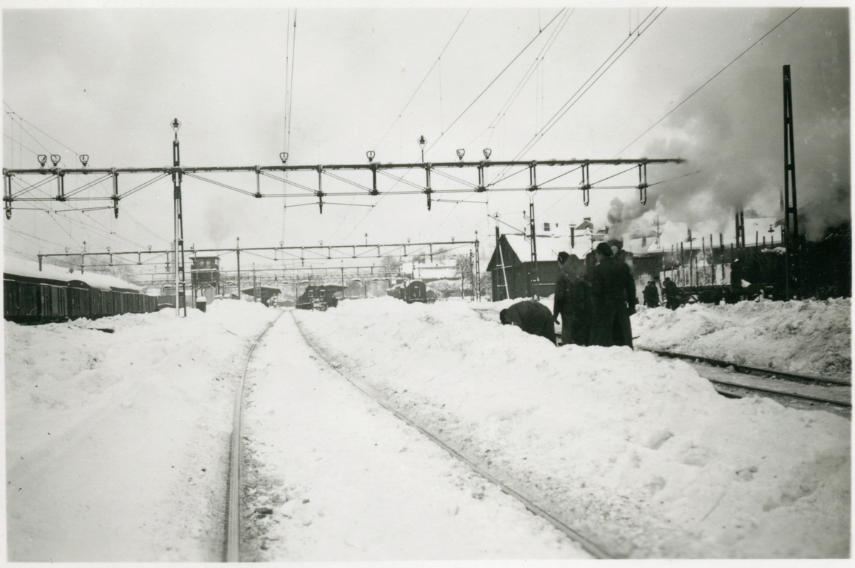 Vy på elektrifierad bangård med personal och byggnader i bild under vintertid.