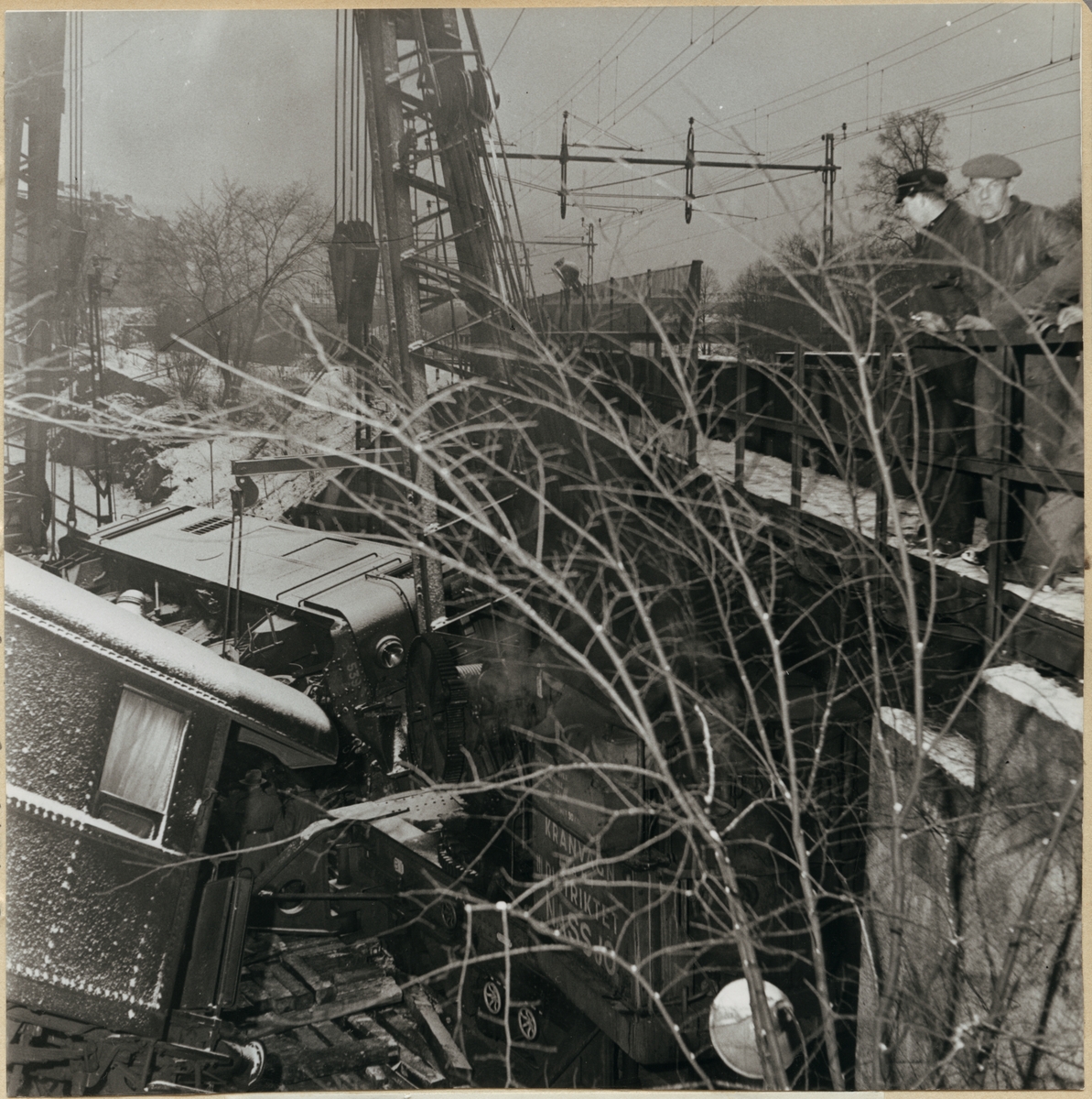 Ångkran Statens Järnvägar, SJ A1 "Nässjö" och SJ A2 "Ånge" bärgar ellok SJ Dk 539 vid olyckshändelsen i Tomteboda 1950.