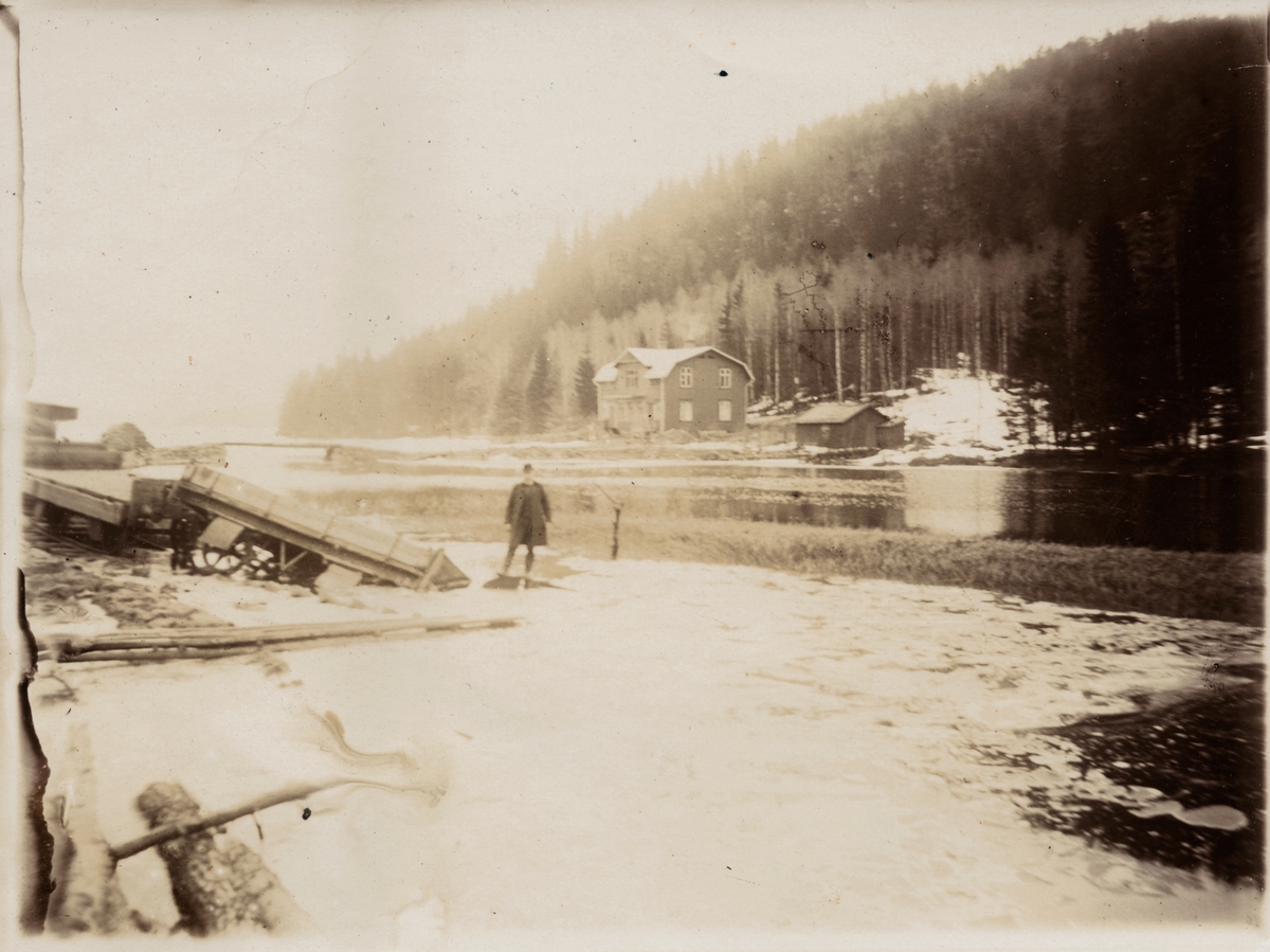 Tågolycka i Hultafors där Göteborg - Borås Järnväg, GBJ K 5 gick i vattnet och sjönk, mannen till höger om godsvagnen är Herr Liljeqvist.