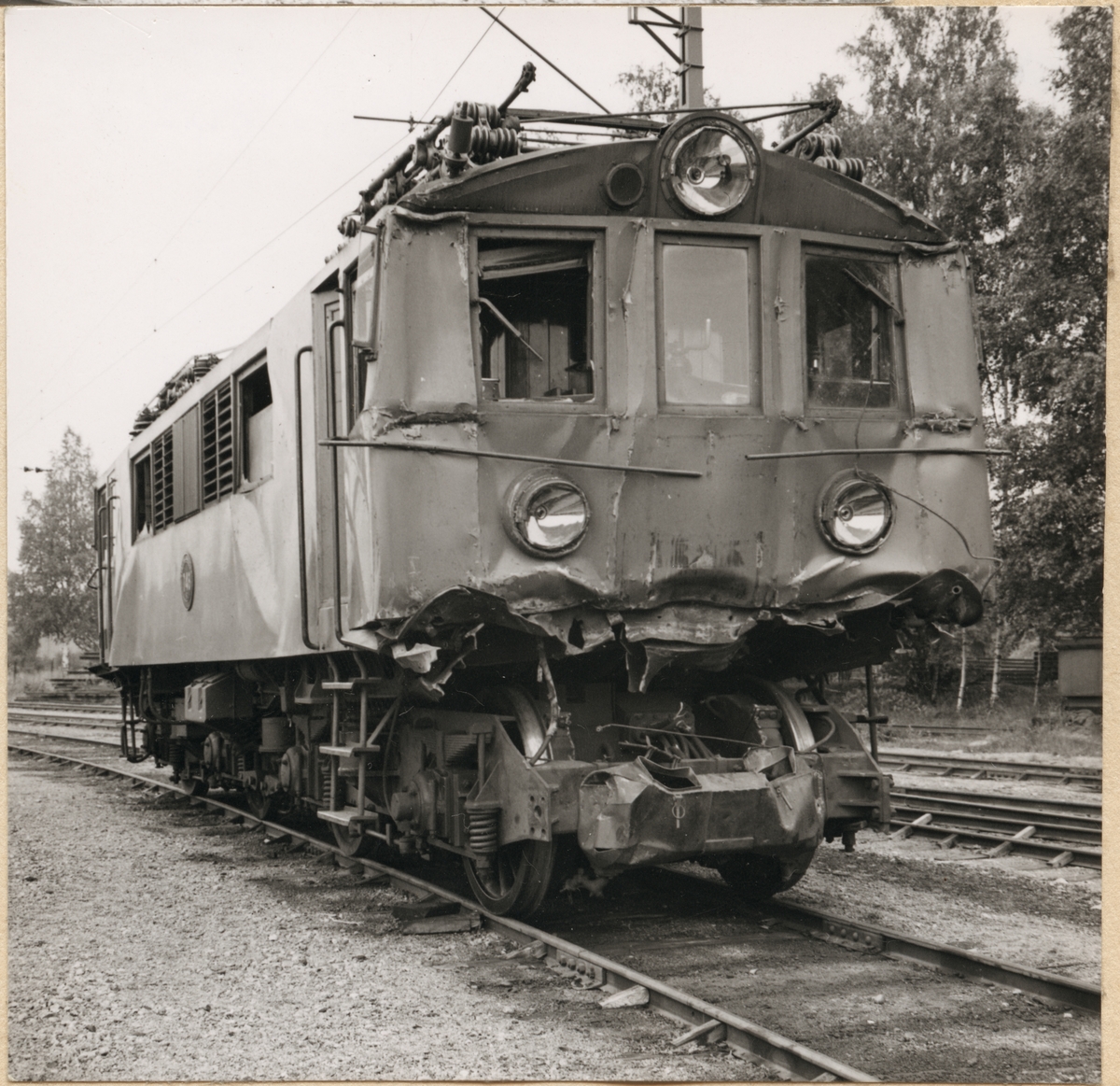 Statens Järnvägar, SJ Bk 748 skador efter kollision i Södertälje 1958.