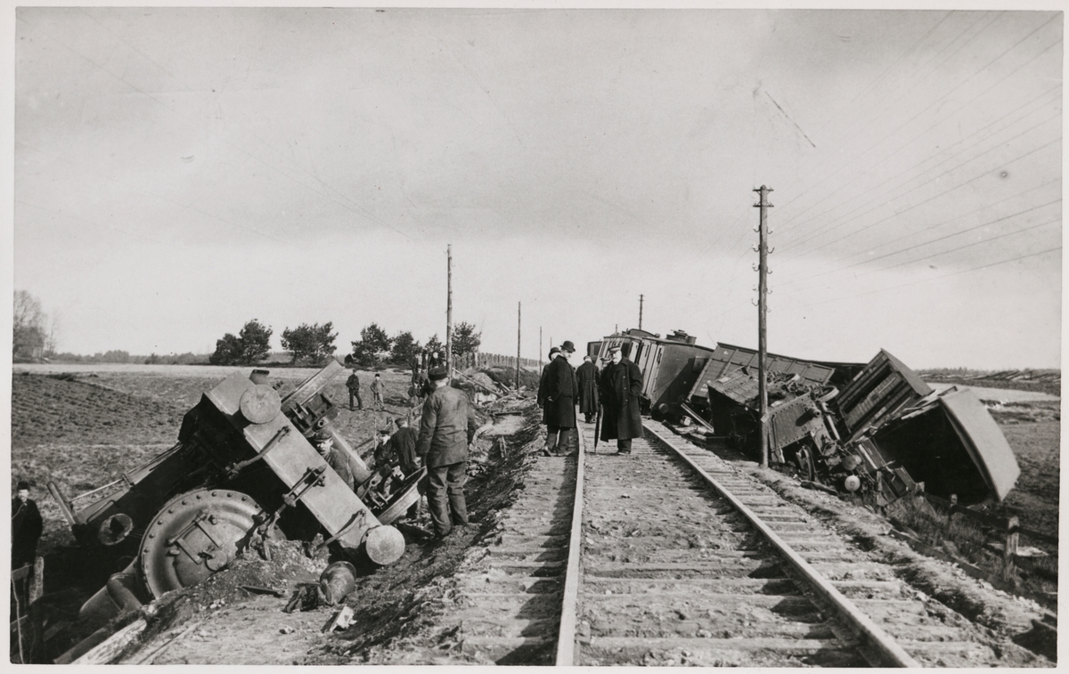 Vy på olycksområde med vagnar, lok och personal i bild på linjen mellan Älmhult och Killeberg.