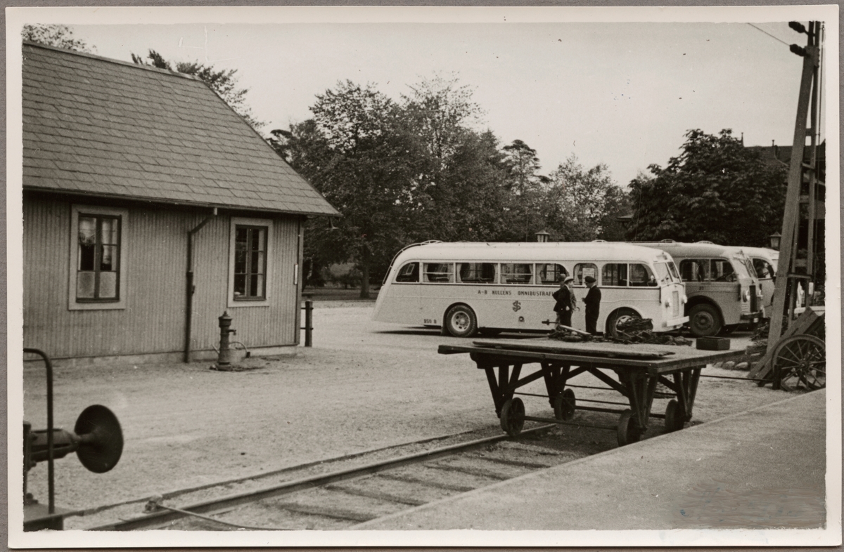 Statens Järnväg, SJ buss 250 B med flera vid Centralstationen i Ängelholm. Stationshuset skymtar längst till höger i bild.