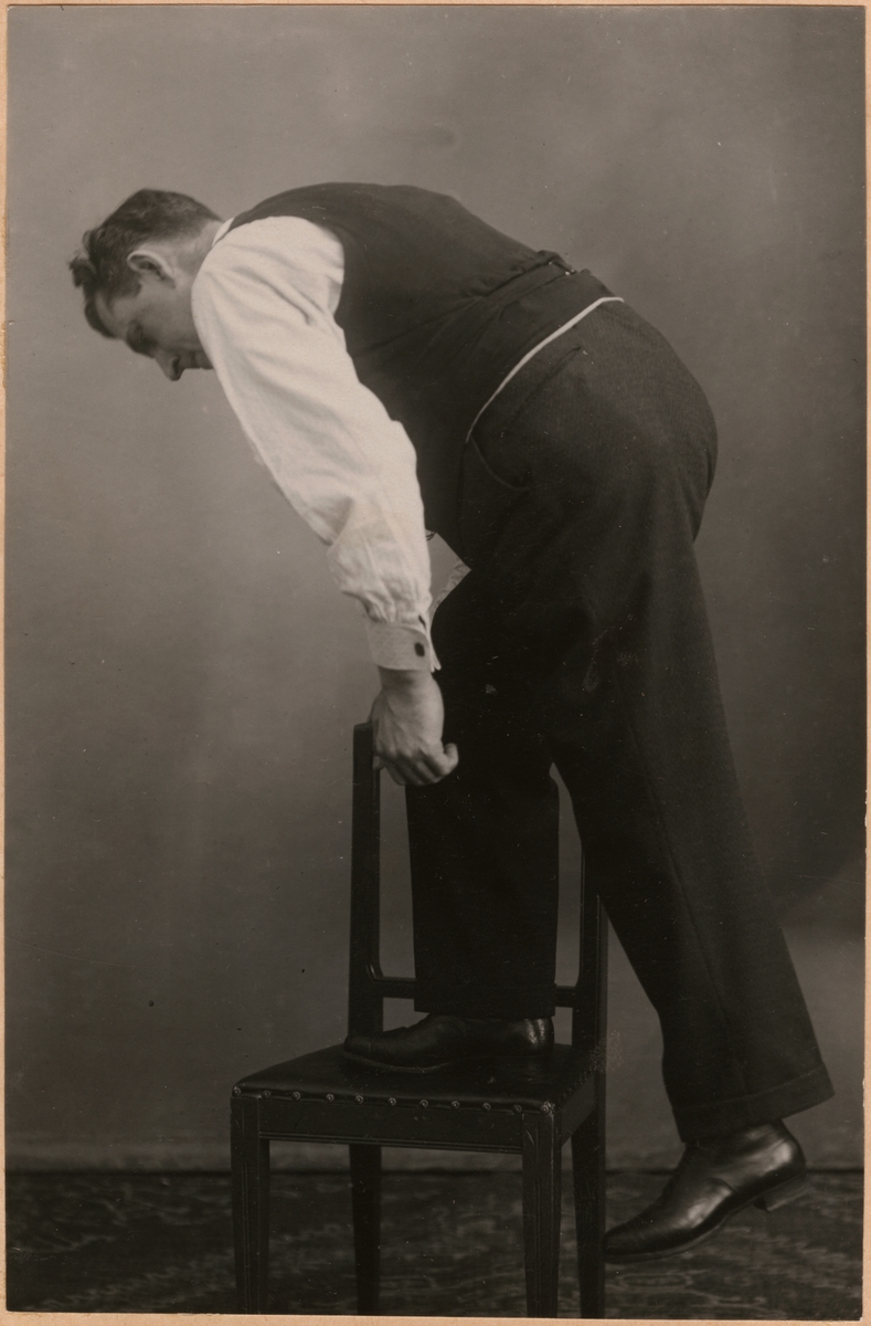 Man med dubbla benproteser vid uppstigning i stol medan han endast tar stöd av stolsryggen.