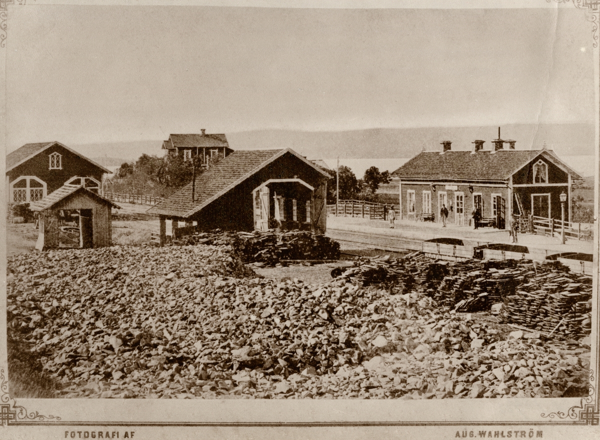 Frövi - Ludvika Järnväg, FLJ, Stationshus vid TGOJ, förutvarande FLJ, foto från 1890 talet. huset byggdes 1871 och revs 1907. Banvaktstuga i bakgrunden byggdes 1873 och revs 1958.