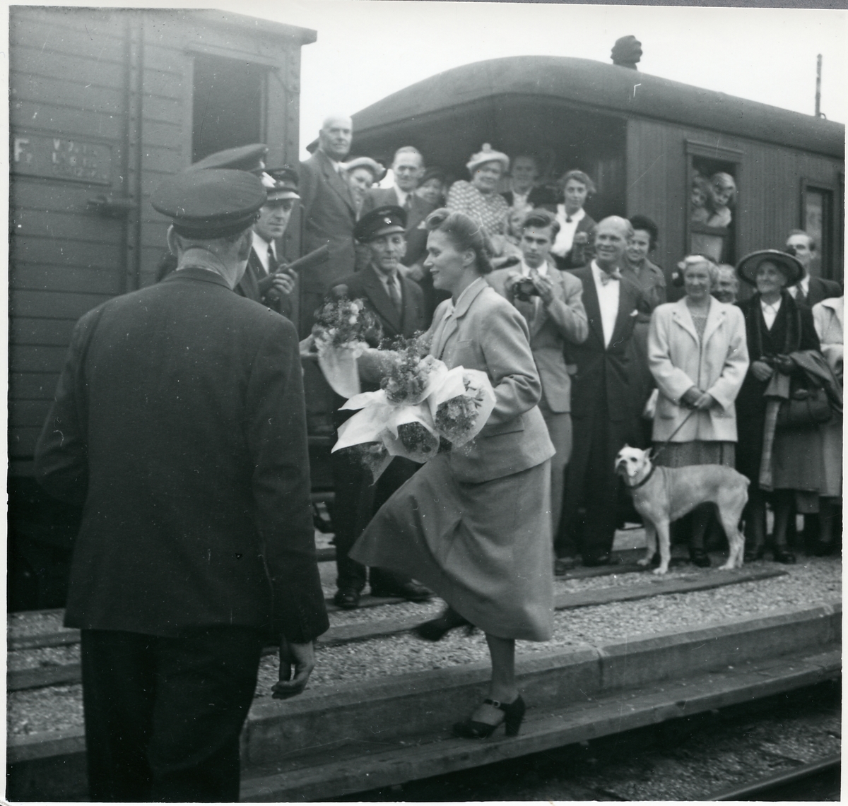 Prostinnan Lundgren överlämnar blommor till tågpersonalen i Köping