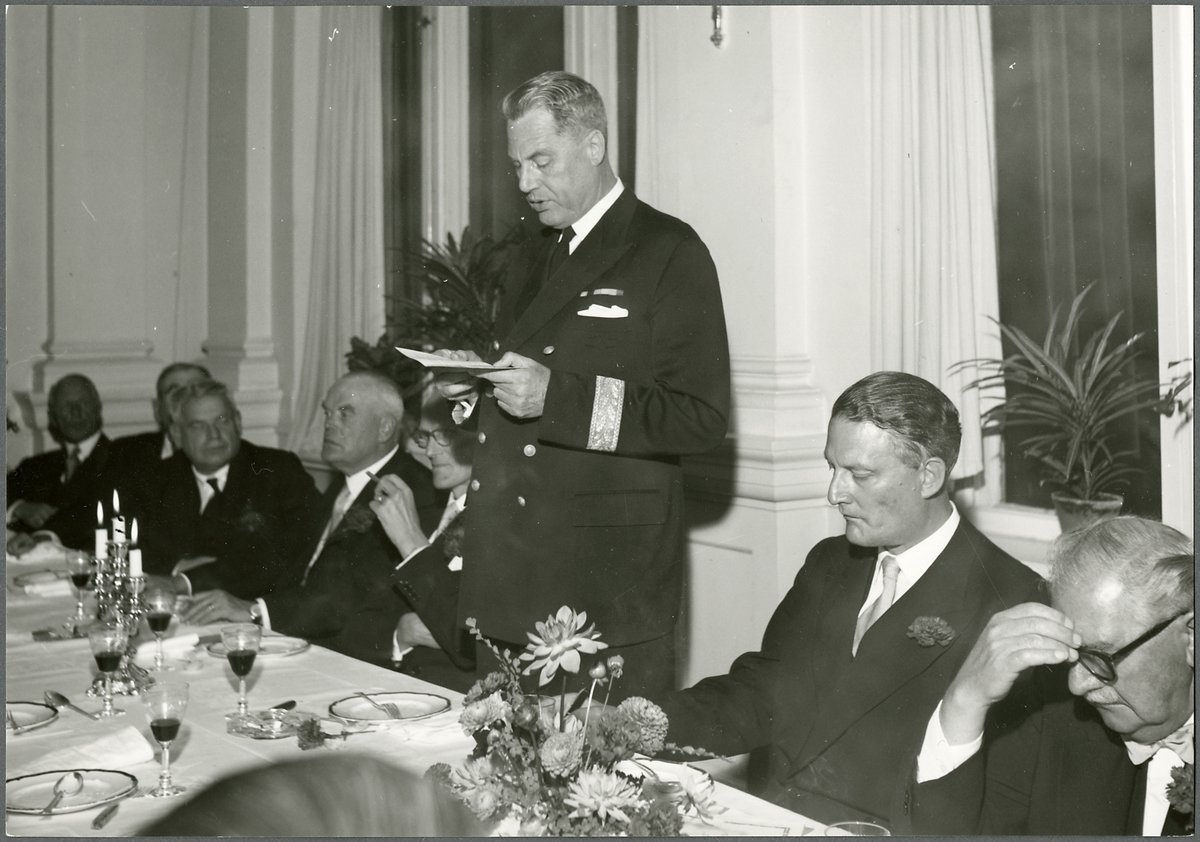 Landshövding Erik Von Heland håller tal för Generaldirektör Erik Upmark med flera på invigningsmiddagen på stadshotellet i Karlshamn.