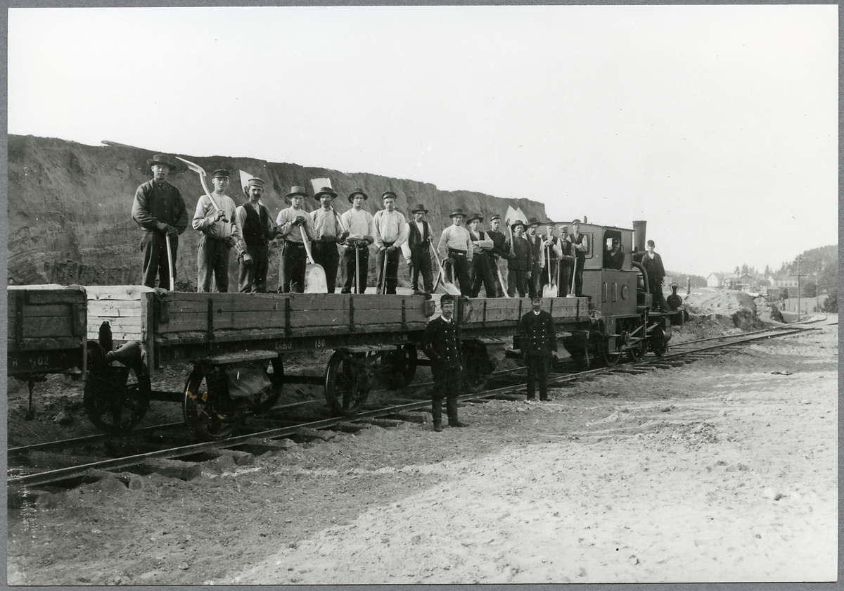 Borås - Alvesta Järnväg, BAJ lok 21. Banarbetare med spadar på ett gruståg.