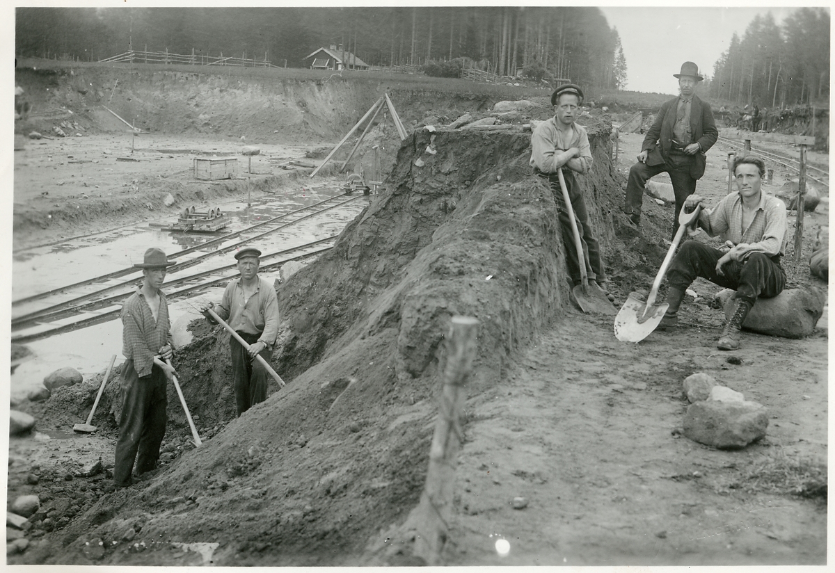 Rälsläggningen vid Prästeryds station. Rallare. Decauvillespår, de färdiga rälslängder användes som provisoriska banor för banarbetsfordon.