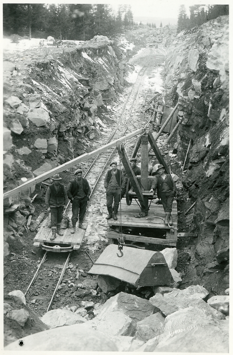 Bergskärning mellan Ulricehamn och Jönköping. Skärning 4/100. Decauvillespår, de färdiga rälslängder användes som provisoriska banor för banarbetsfordon.