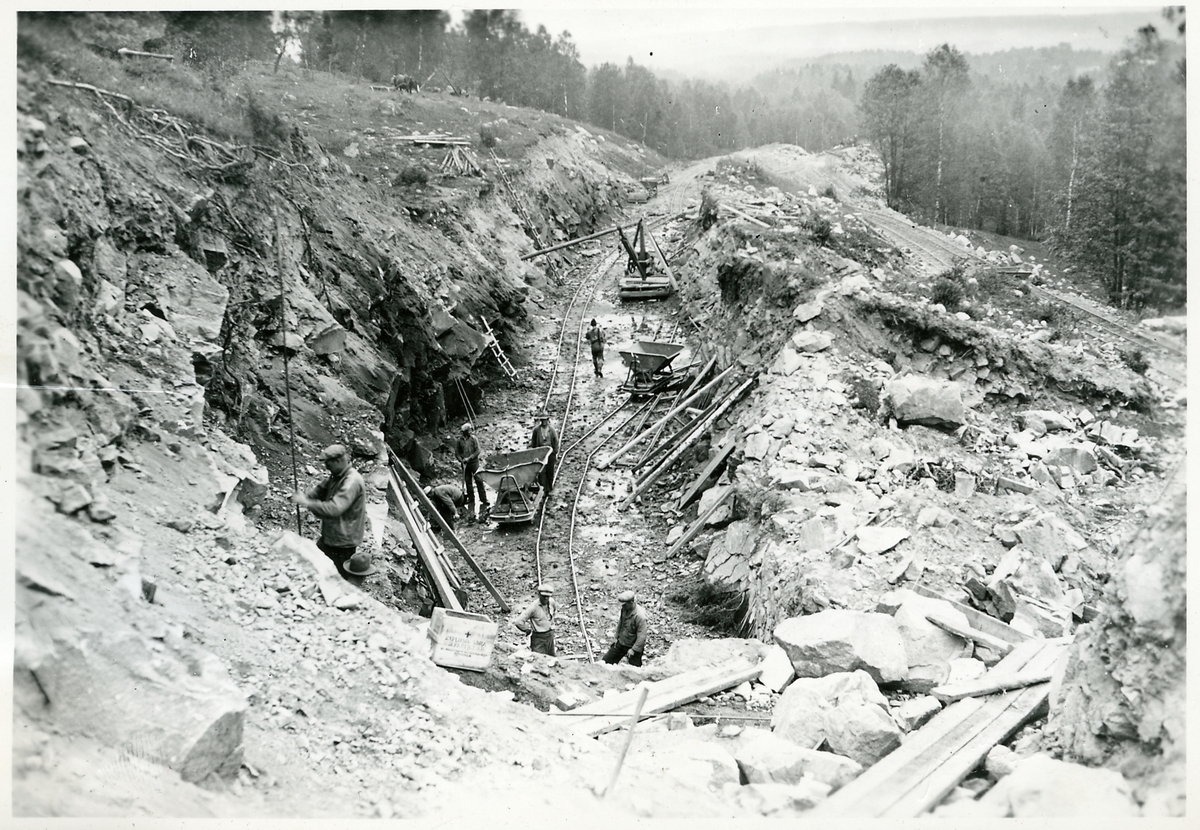 Bergskärning vid 27/500. Decauvillespår, de färdiga rälslängder användes som provisoriska banor för banarbetsfordon.