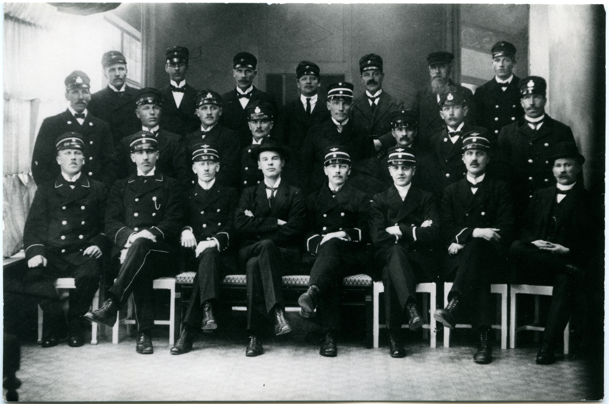 Personalen vid Väderstad - Skänninge - Bränninge Järnväg omkring 1915. Taget i Skänninge.