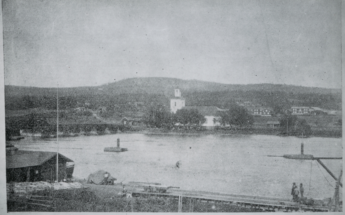 Vy över Segersta med hästbanan Landa - Edsänges ändstation vid det gamla färjelägret i förgrunden.