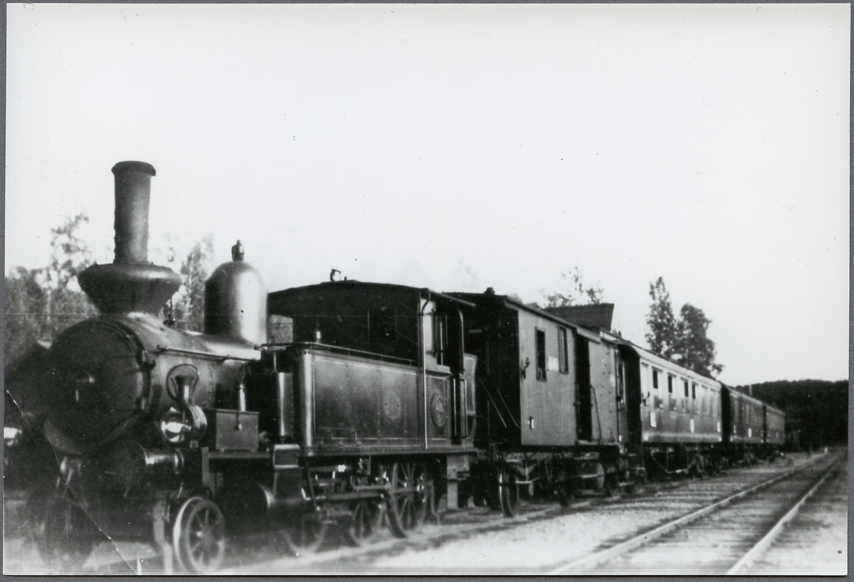 Svartälvs Järnväg, SEJ. Åskådartåg för inbjudna gäster som anordnades i samband med övningsbombningen av banan i maj 1934. Loket är Statens Järnvägar, SJ Hva 1485, ursprungligen Markaryd - Veinge Järnväg, MaVJ lok 3.