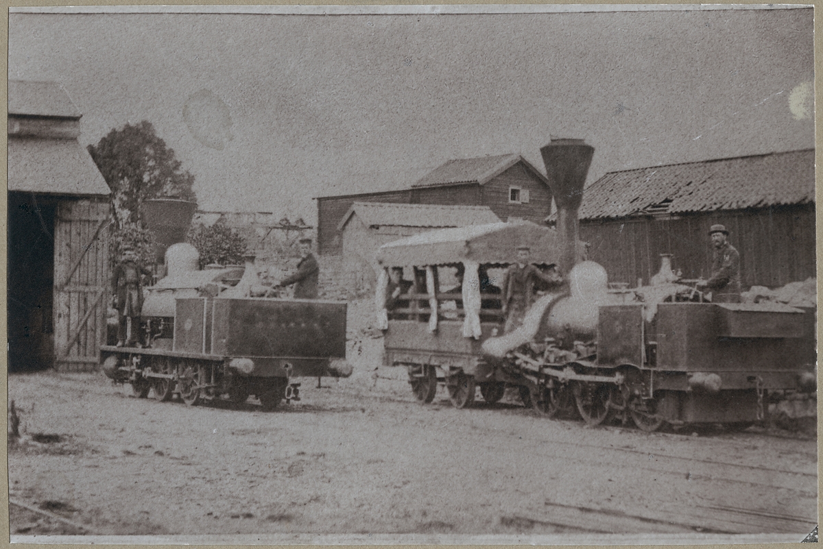 Del av Kärrgruvans bangård. Från Vänster Norbergs Järnväg, Norbergs J lok 1 "Norberg" med lokförare N P Lantz och Norbergs J lok 2 "Åmänningen" med förare Abr. Andersson.