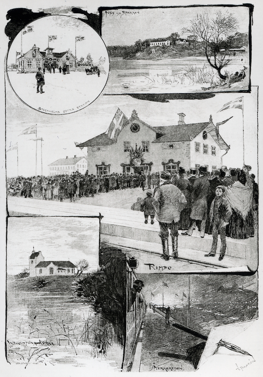 Titel: Invigning av smalspårig järnväg melan Stockholm och Rimbo. Teckningar av V. Andrén