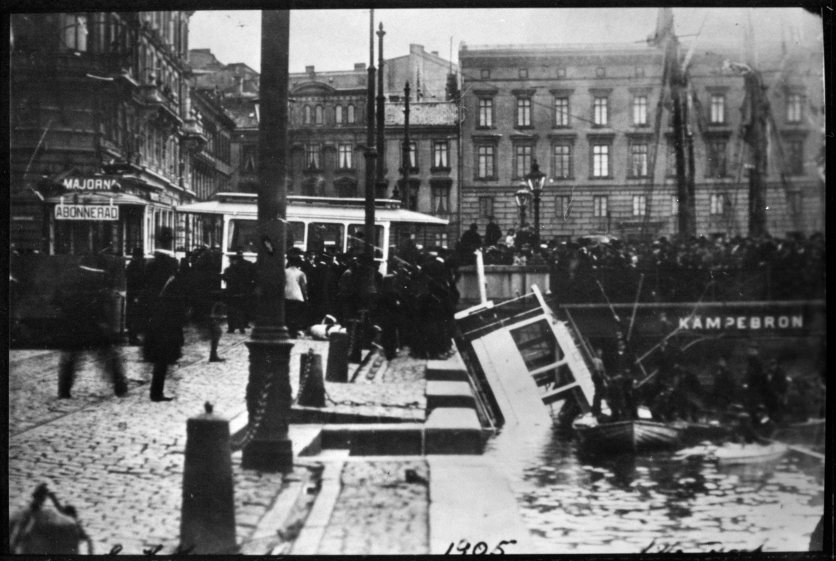 Spårvagnsolycka vid Kämpebron. En spårvagn körde ner i Stora Hamnkanalen i Göteborg efter kollision mellan två spårvagnar, många åskådare på plats.