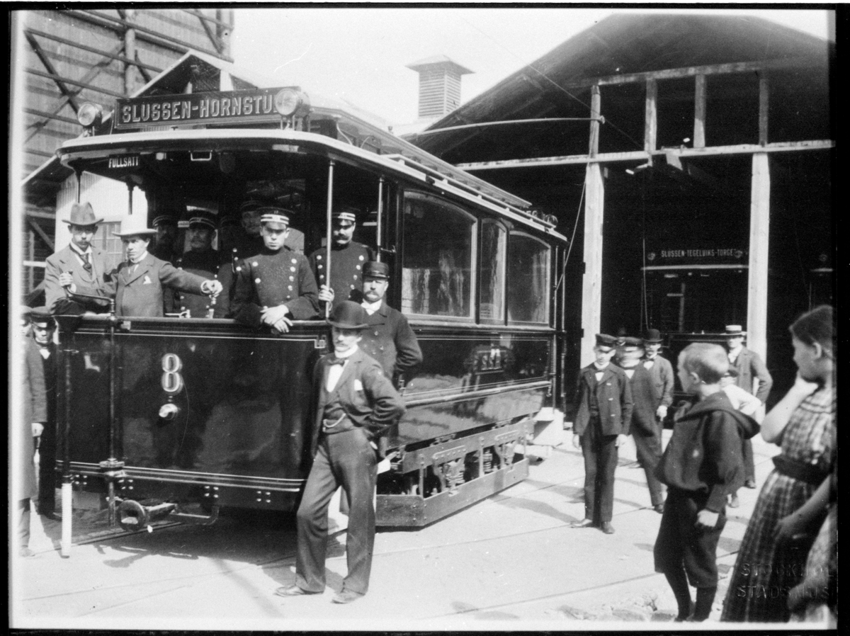 Stockholms Södra Spårvägsaktiebolag, SSB A1 8 med personal utanför spårvagnshallen.