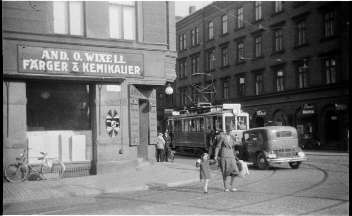Vid Schougens bro. Spåren där mamma och barn går ändhållplats för linje 7. Lennart Welanders första spårvagnsbild!