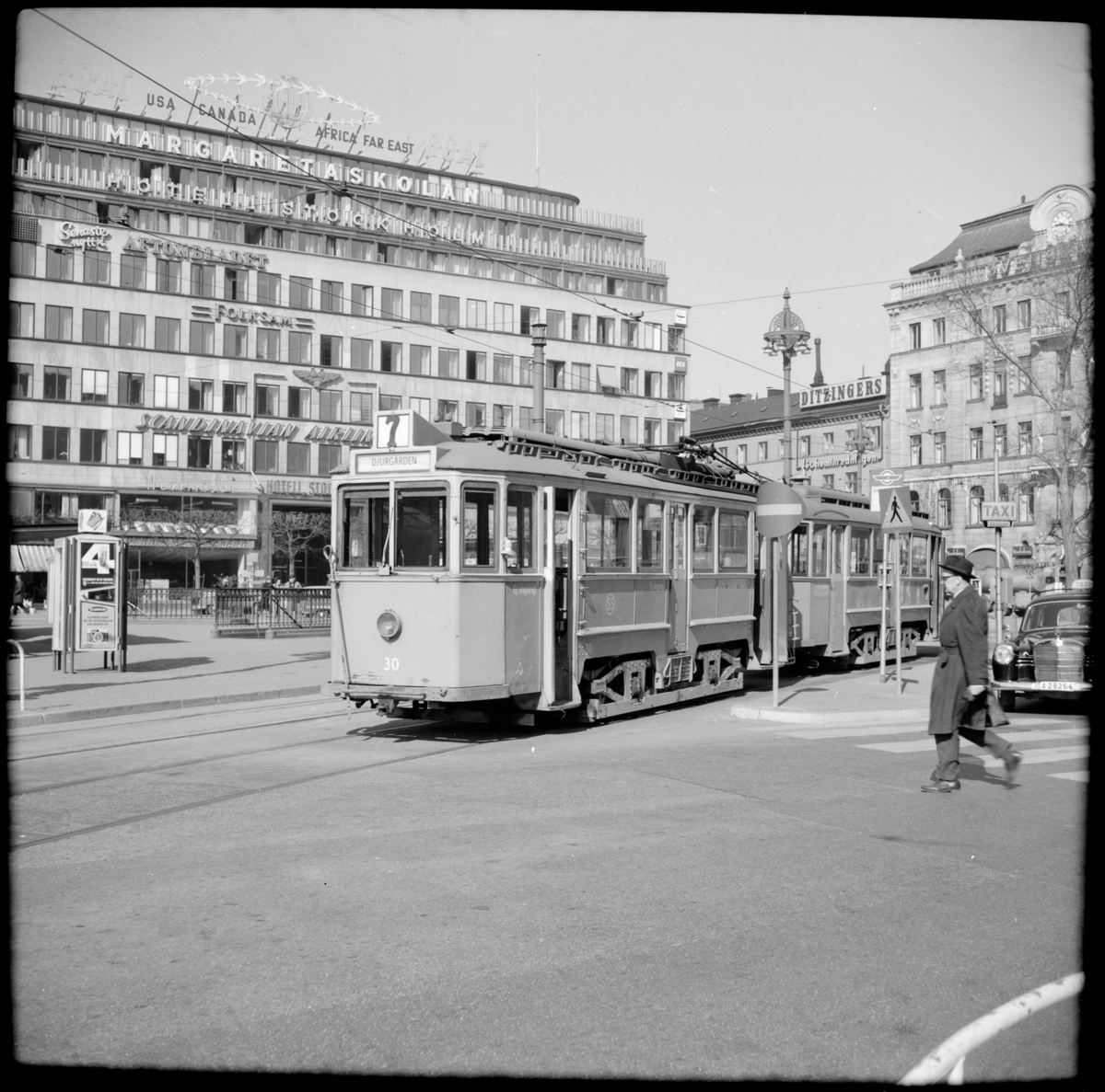 Aktiebolaget Stockholms Spårvägar, SS A4 30 "jitterbugg" linje 7 Norrmalmstorg - Djurgården. Vagn med trasig strömavtagare inbogserad på Norrmalmstorg.