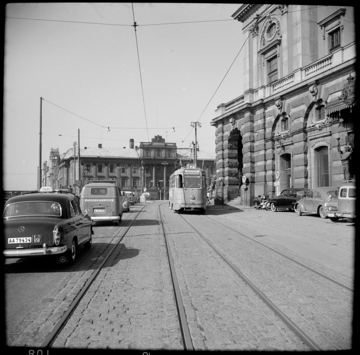 Aktiebolaget Stockholms Spårvägar, SS A27 492 "mustang" linje 2 Fredhäll - Karlaplan i trafik på Strömgatan vid Operan.