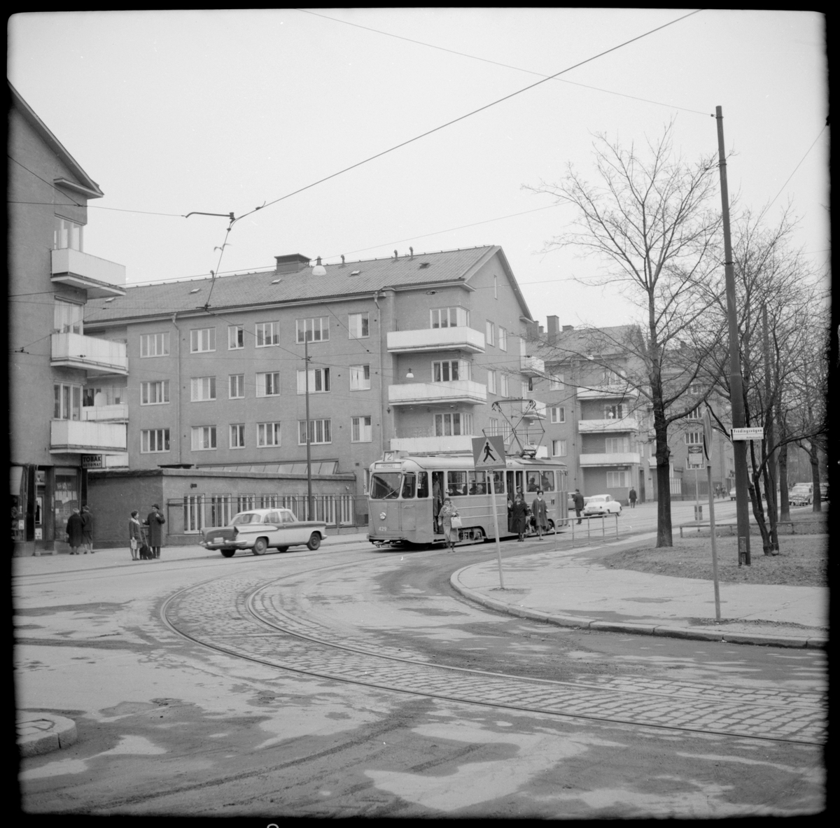 Aktiebolaget Stockholms Spårvägar, SS A25 429 "mustang" linje 2 Fredhäll - Karlaplan vid sista avstigningshållplats före ändhållsplats Fredhäll.