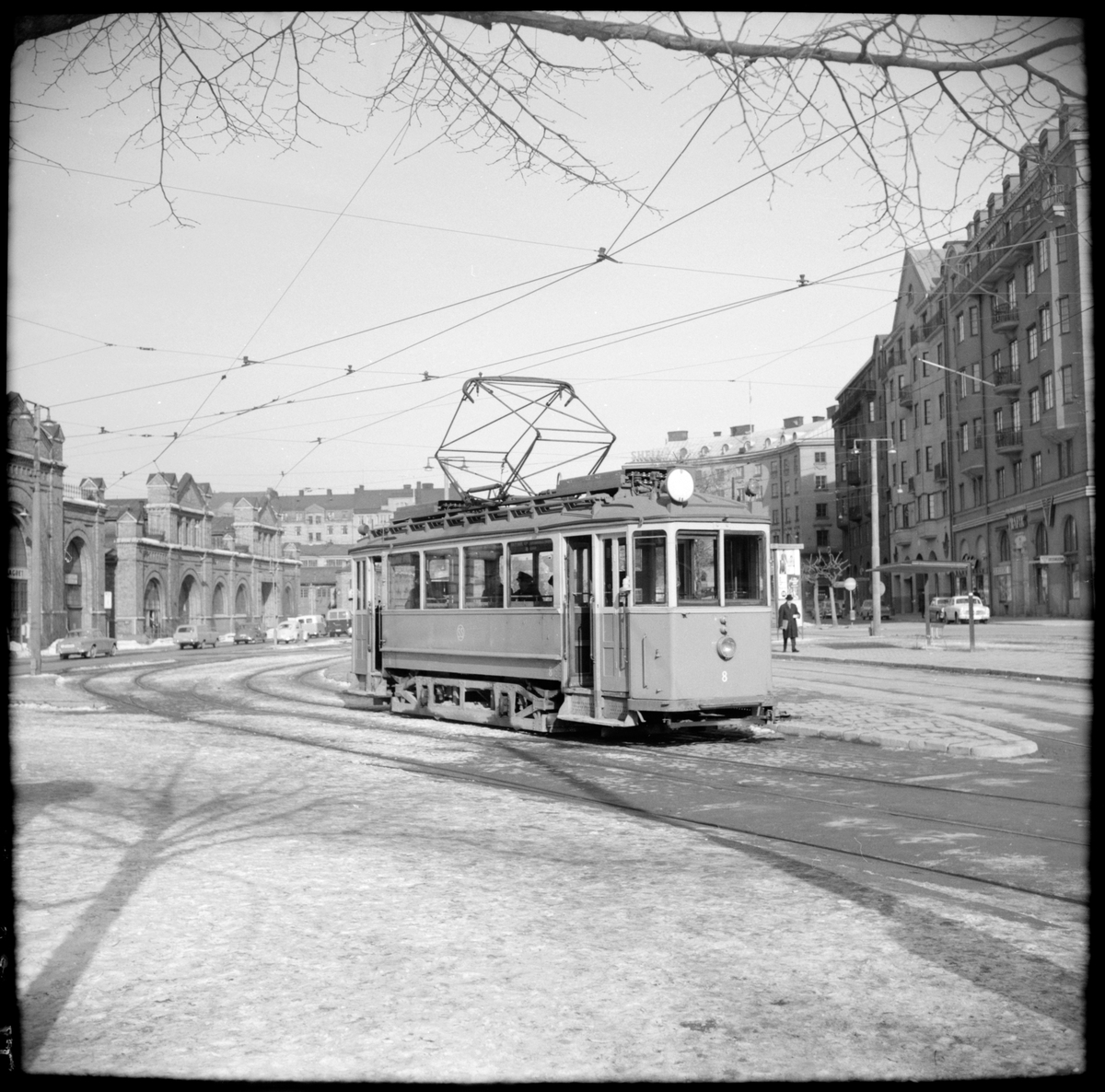 Aktiebolaget Stockholms Spårvägar, SS A1 8 vid hållplats Birger Jarlsgatan - Runebergsgatan. Växelmotorvagn på Eriksbergsplan, "Dagens Eko" kallad.