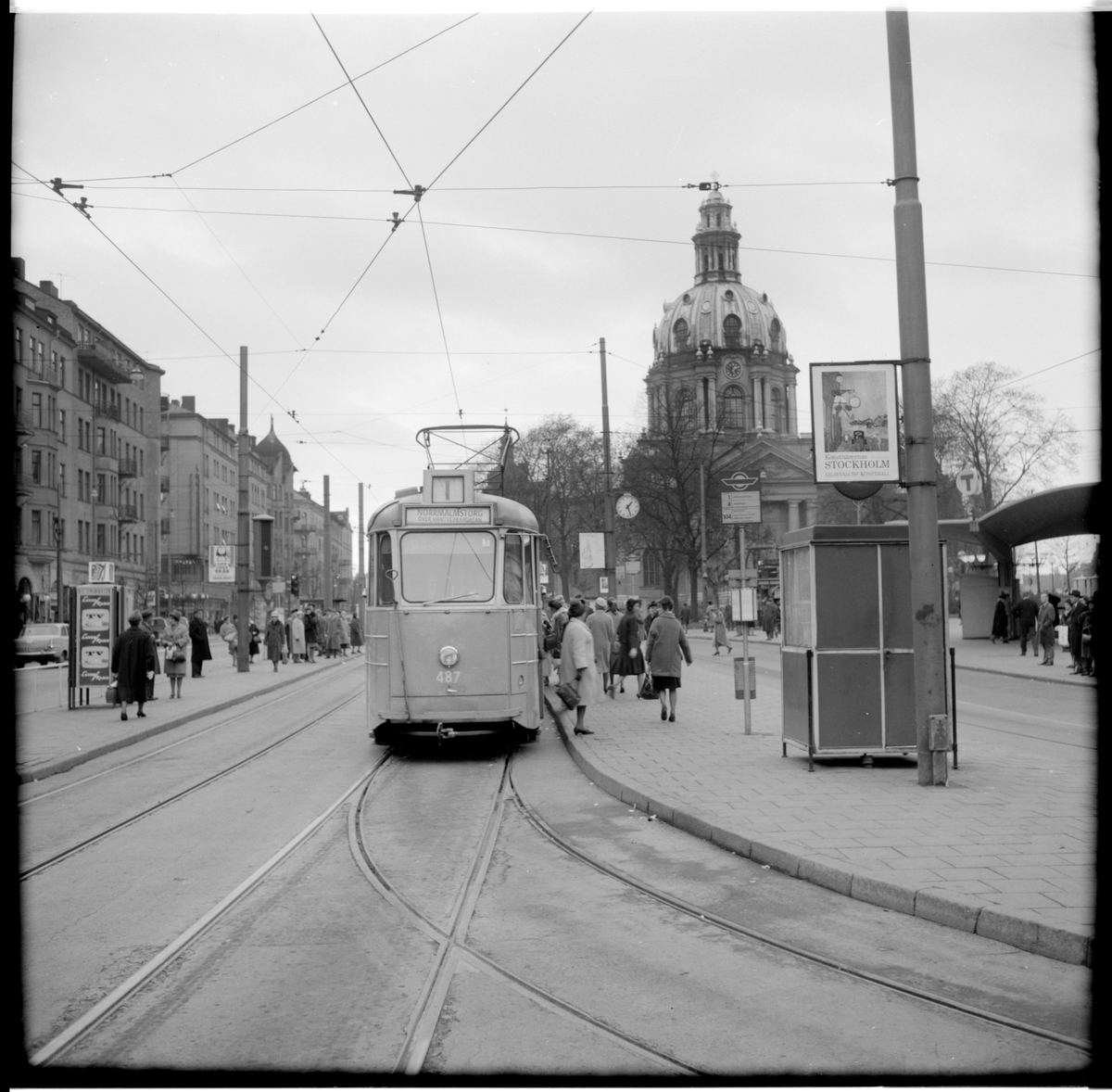 Aktiebolaget Stockholms Spårvägar, SS A26 487 "mustang" linje 1 Norrmalmstorg - Rosenlund på hållplats Odenplan.
