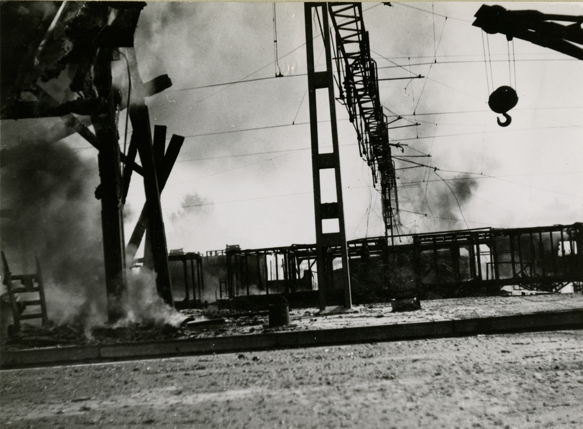 Brand efter explosionen i ett tyskt ammunitionståg på Avesta Krylbo station.