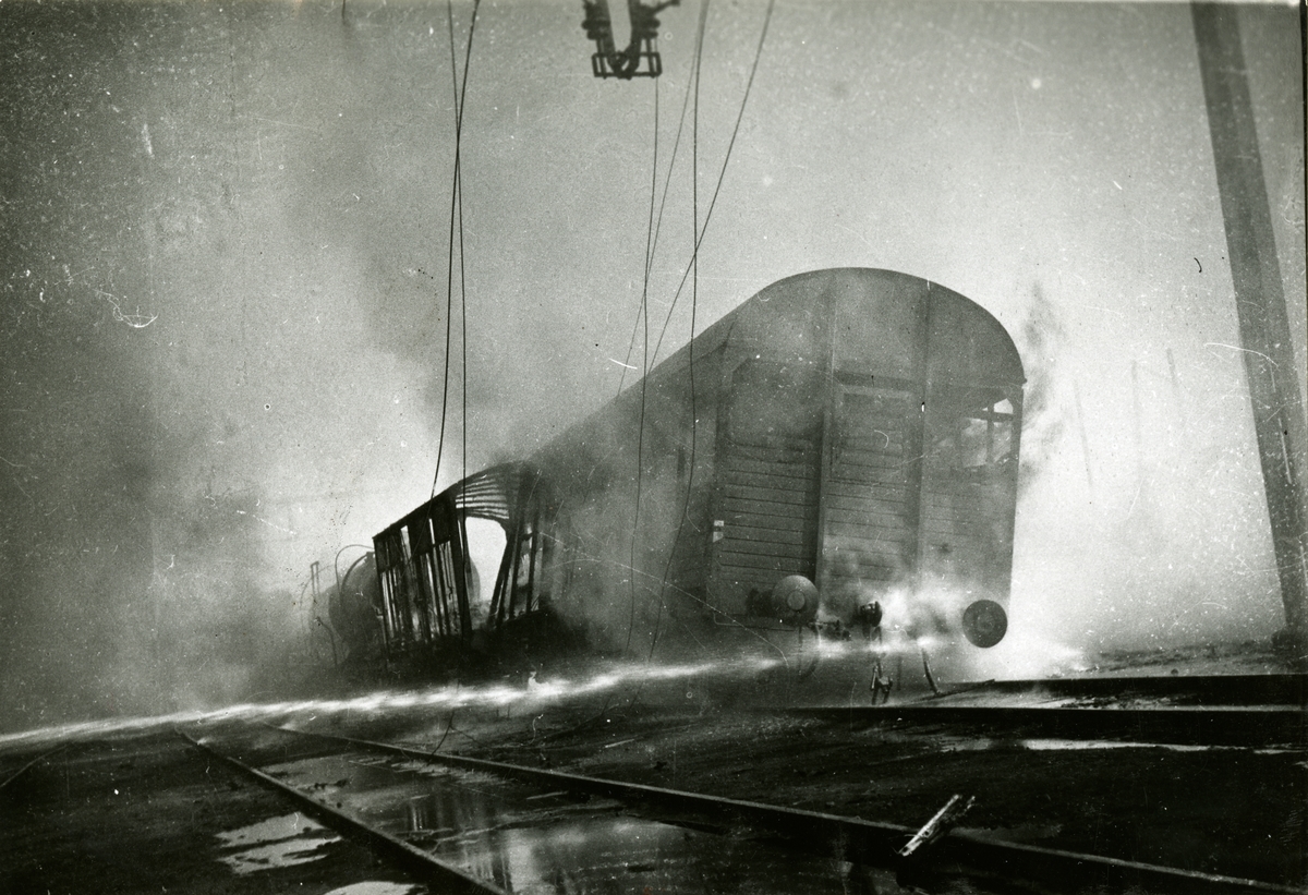 Brand i godsvagnar på Avesta Krylbo bangård efter explosion i ett tyskt ammunitionståg.