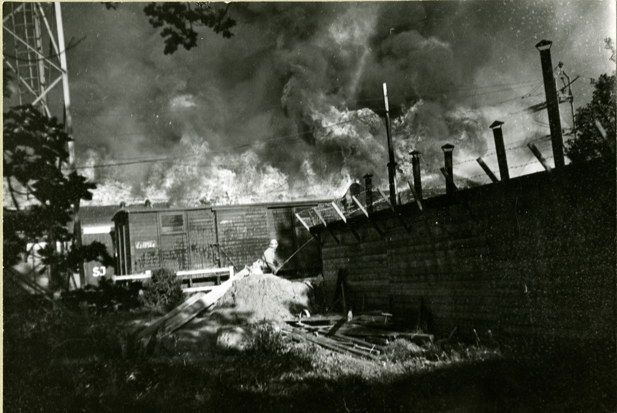 Titel: Brand i godsvagnar på Avesta Krylbo bangård efter explosion i ett tyskt ammunitionståg.