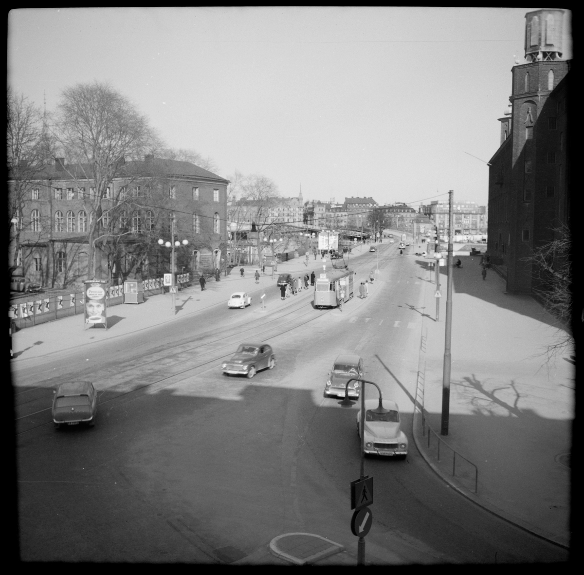 Utsikt från före detta Karolinska Institutet mot Stadshuset - Tegelbacken. Aktiebolaget Stockholms Spårvägar, SS ses mitt i bilden.