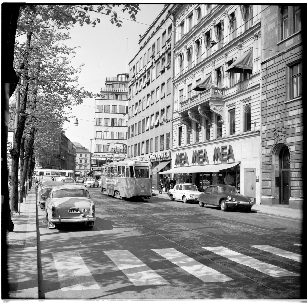 Aktiebolaget Stockholms Spårvägar, SS A25 420 "mustang" linje 10 Värtan - Slussen - Hornstull på Kungsträdgårdsgatan.