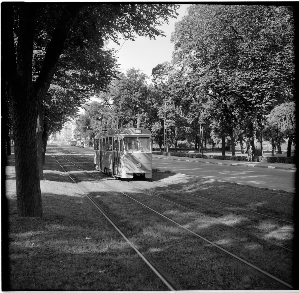 Norrköping Spårvägar, NS M67 154 högervagn på provtur i Norra Promenaden under vänstertrafik.