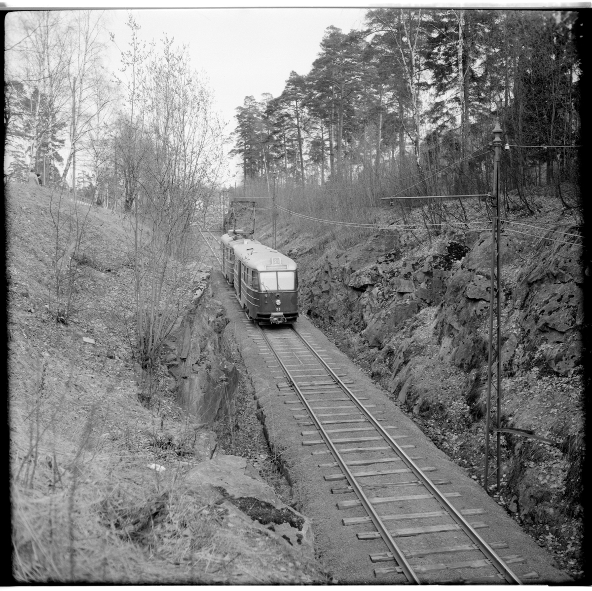 Trafik Aktiebolaget Stockholm Södra Lidingöns Järnväg, SSLidJ B24(A) 33 "ängbyvagn" linje 21 i Herserudsbacken. I fonden skymtar Baggeby station.