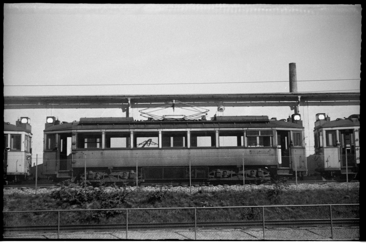 Spårvagnar tillhörande Stockholms Spårvägar, SS, står på spåret utanför en vagnhall.