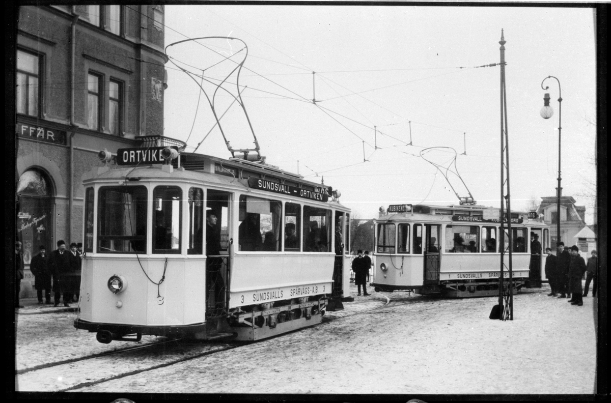 Vid förgreningspunkten i Sundsvall står till höger i bild Sundsvalls Spårvägsaktiebolag, SSAB spårvagn 3 som trafikerar till Ortviken och spårvagn 1 som trafikerar till Kubikenborg.
