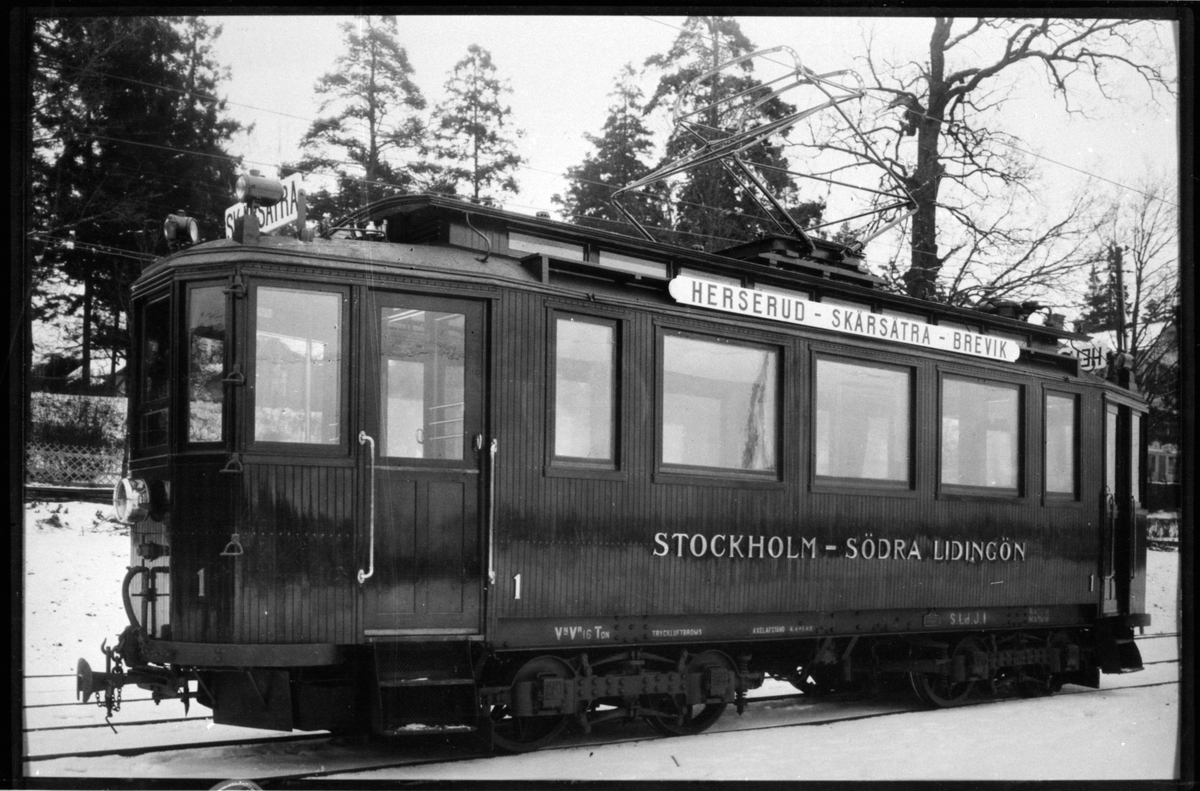 Leveransbild på Trafik AB Stockholm Södra Lidingöns Järnväg, SSLidJ spårvagn 1 som trafikerade linjen Herserud - Skärsätra - Brevik.