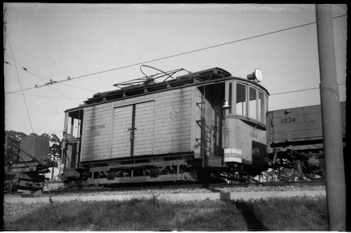 Vid Gubbängsbanans bygge vid Sofiaplan står Aktiebolaget Stockholms Spårvägar, SS Paketvagn M1 1252 på spåret.