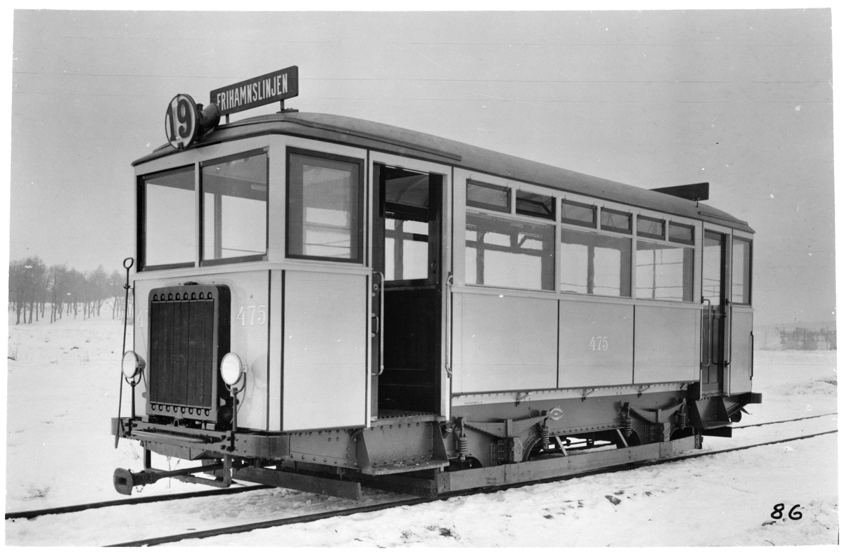 Aktiebolaget Stockholms Spårvägar, SS bensinspårvagn 475, Frihamnslinjen, som gick mellan Karlaplan och Frihamnen. Fotograferad i Sundbyberg 1928.