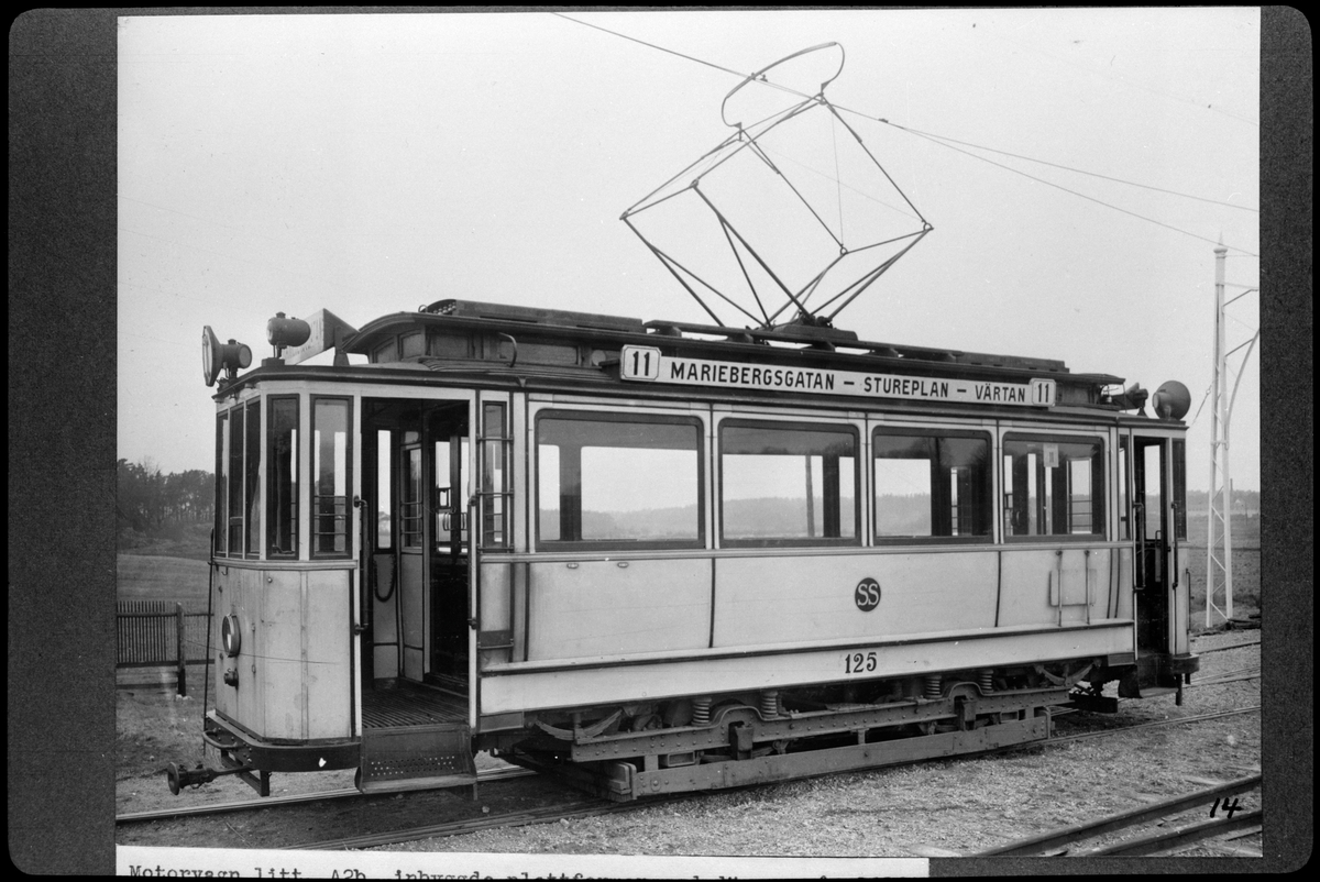 Aktiebolaget Stockholms Spårvägar, SS A2b 125, linje 11, som gick mellan Mariebergsgatan och Värtan. Fotograferad vid Hagalund järnvägsstation 1922.