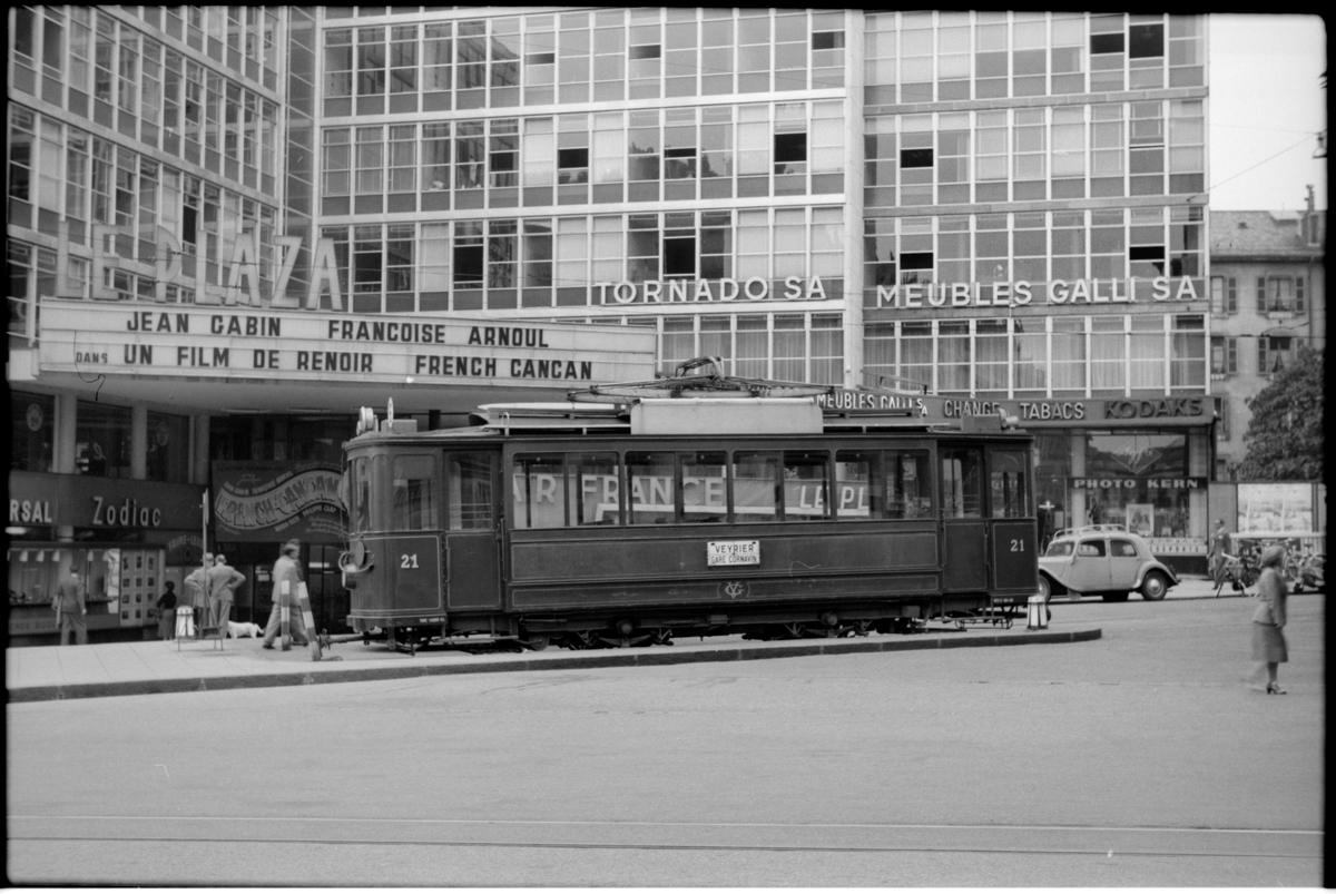 Spårvagn 21 utanför biograf Le Plaza på Rue du Cendrier 21 i Genéve.
