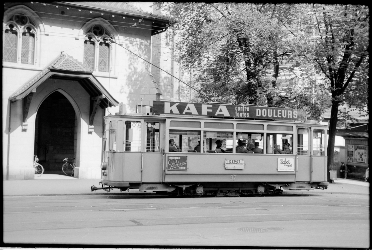 Utanför Église Saint-François kyrka i Lausanne ses spårvagn 97.