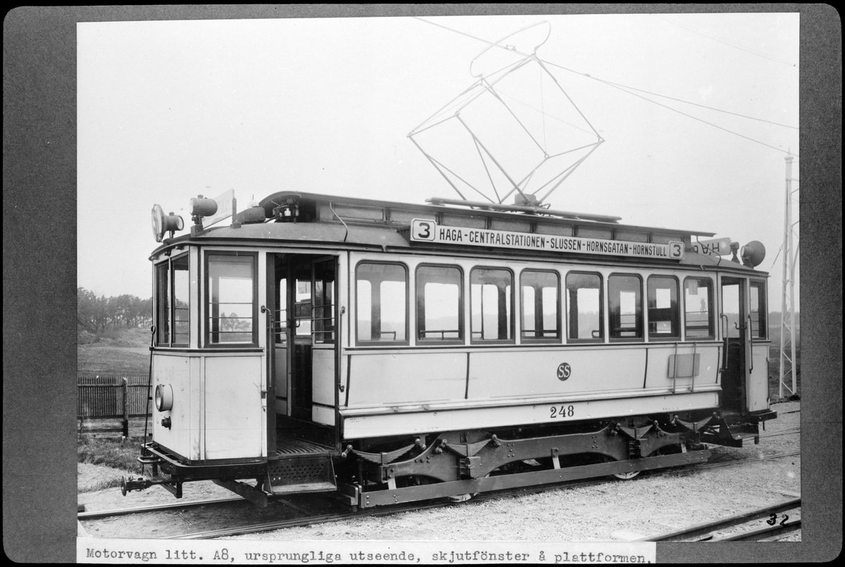 Aktiebolaget Stockholms Spårvägar, SS A8 248. Den trafikerade linje 3 mellan Haga och Hornstull. Fotograferad vid Hagalund järnvägsstation.