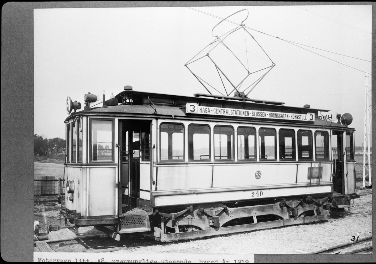 Aktiebolaget Stockholms Spårvägar, SS A8 240. Den trafikerade linje 3 mellan Haga och Hornstull. Fotograferad vid Hagalund järnvägsstation.