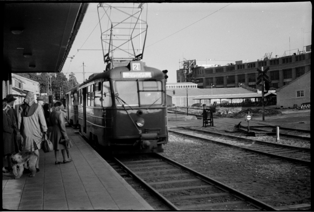 Resande på AGA stationen. Trafik Aktiebolaget Stockholm Södra Lidingöns Järnväg, SSLidJ A24B 21 "ängbyvagn".