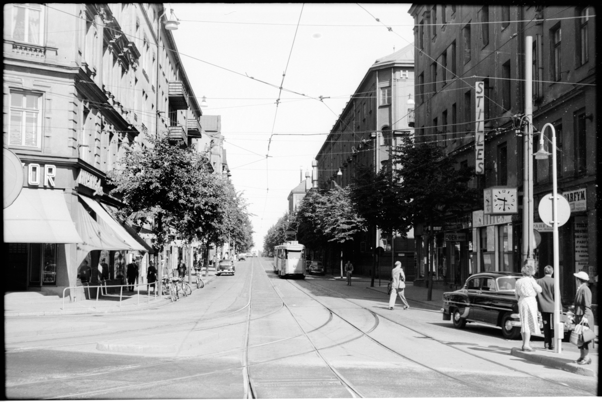 På Nortullsgatan sedd från Odenplan trafikerar Aktiebolaget Stockholms Spårvägar, SS spårvagn på linje 3, Haga - Slussen - Hornstull.