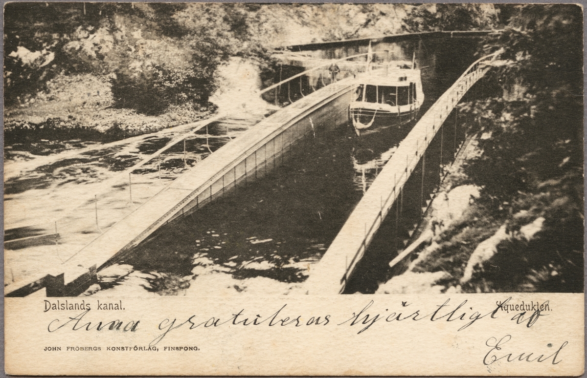 Båt på väg genom akvedukten vid Håverud.