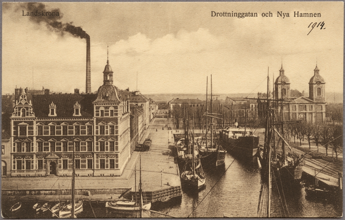 Nyhamn i Landskrona med Drottninggatan och Sofia Albertina kyrka.
