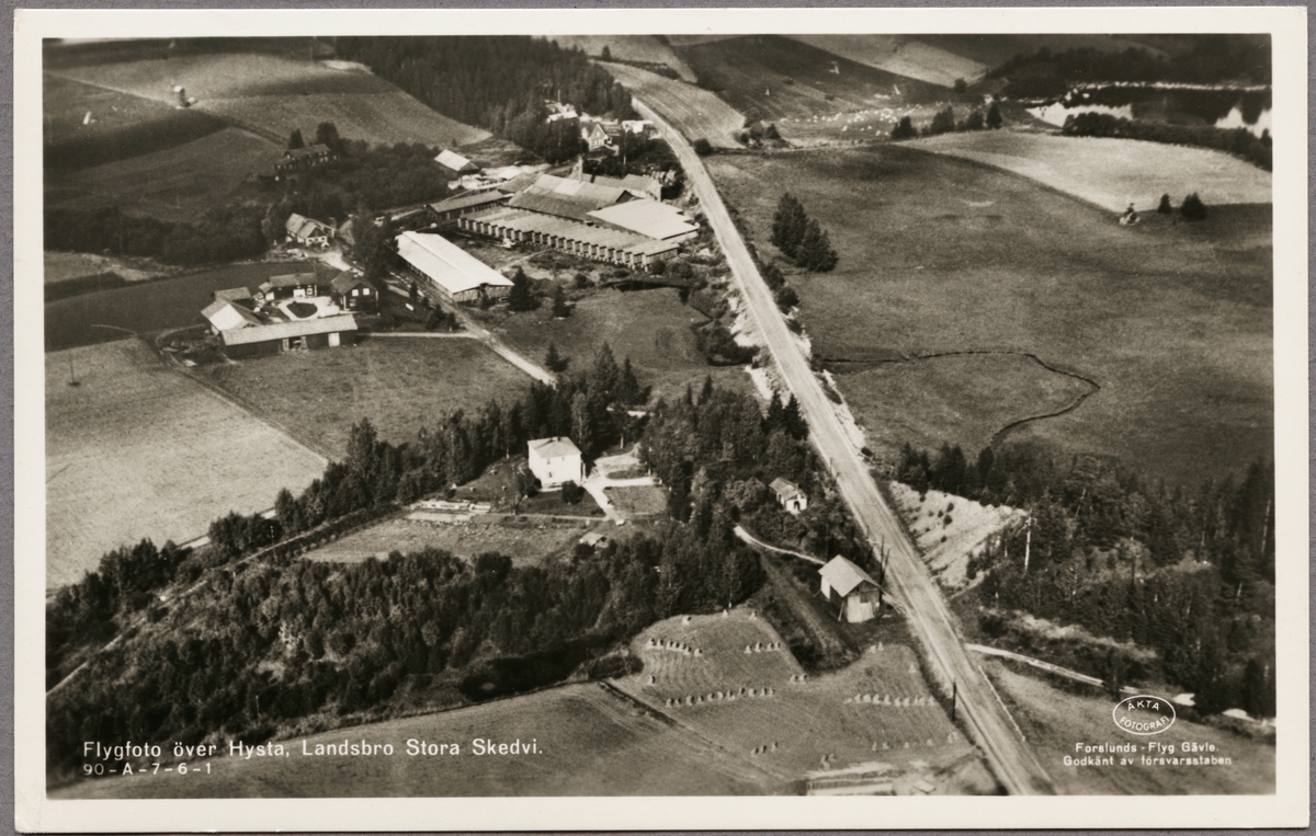 Flygvy över Hysta med Landsbro tegelbruk till vänster om landsvägen.