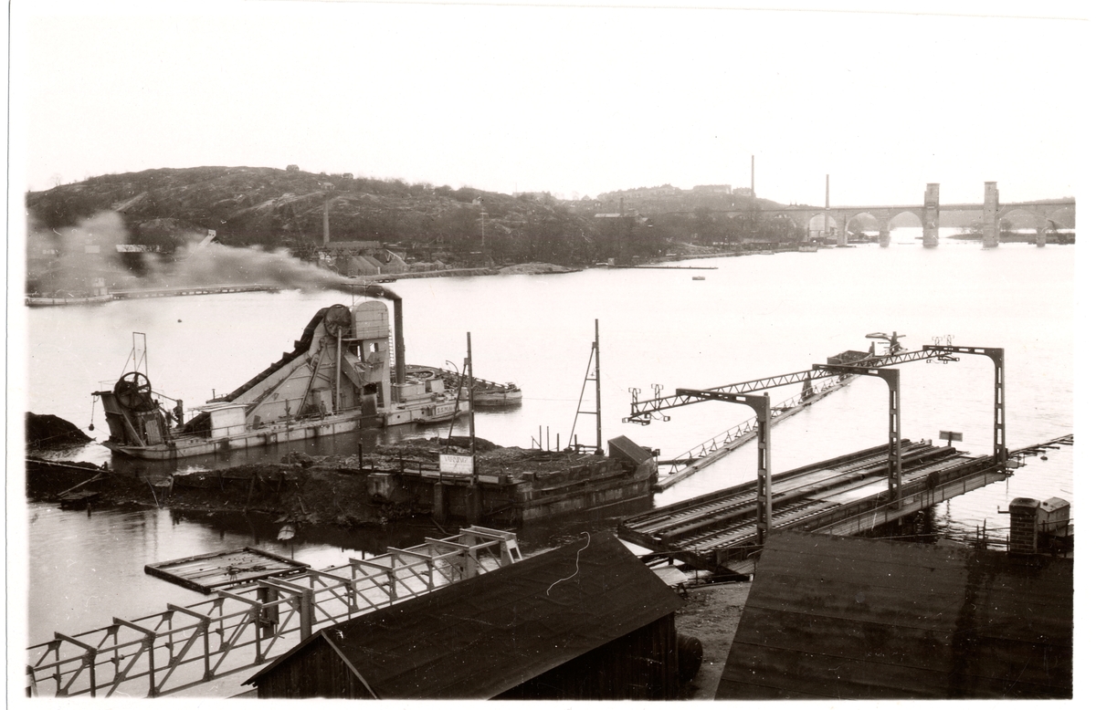 Liljeholmen. Gamla järnvägsbanken muddras bort sedan järnvägen flyttats och går över Årstabron i stället.